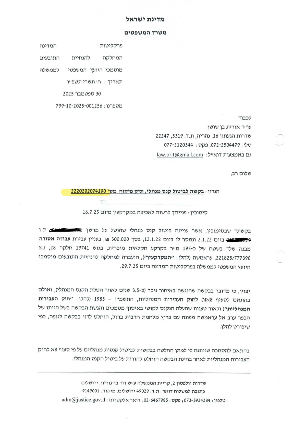 30.9.2025: פרקליטות המדינה (מספר בקשה 799-10-2025-001256) הורתה: הקנס בוטל.